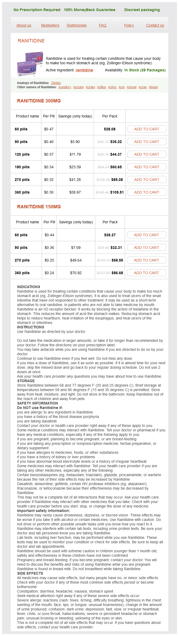 Ranitidine packs: 60 pills, 90 pills, 120 pills, 180 pills, 270 pills, 360 pills
