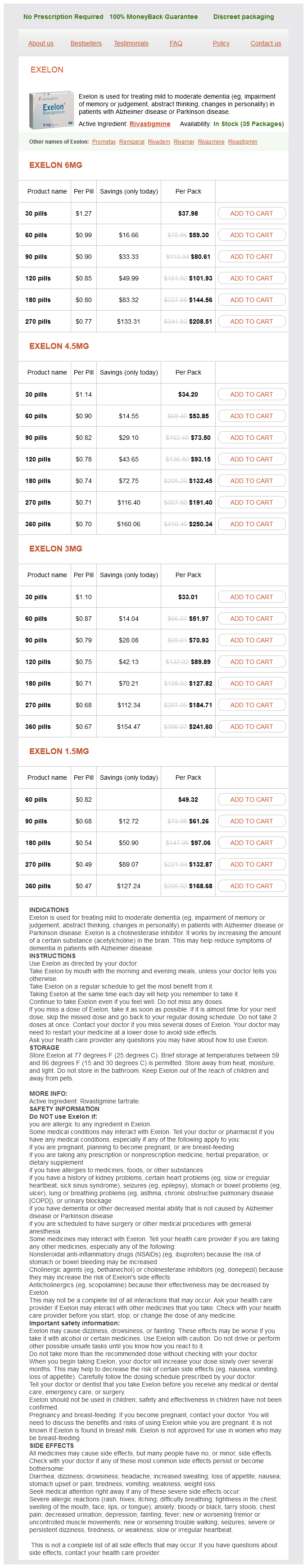 Exelon packs: 30 pills, 60 pills, 90 pills, 120 pills, 180 pills, 270 pills, 360 pills
