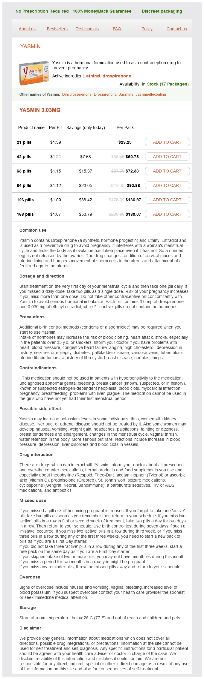 Yasmin packs: 21 pills, 42 pills, 63 pills, 84 pills, 126 pills, 168 pills