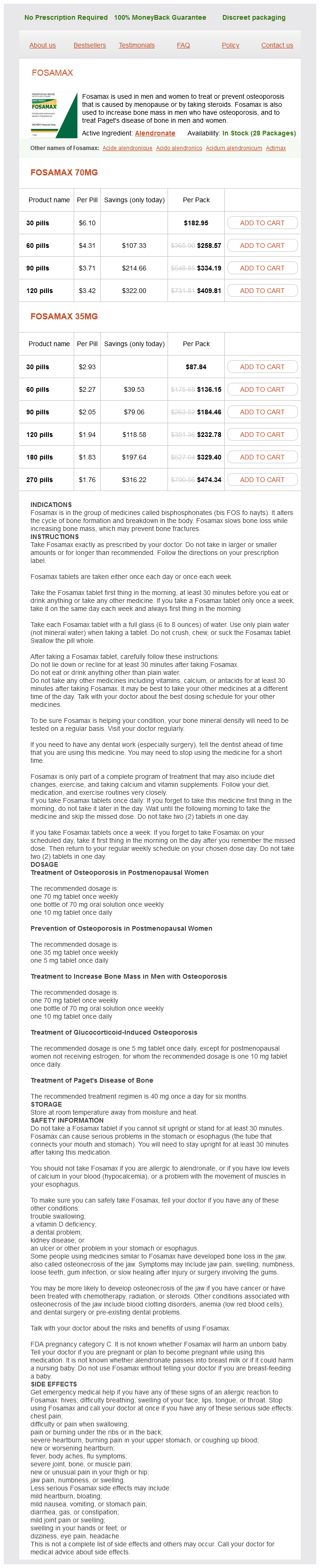 Fosamax packs: 30 pills, 60 pills, 90 pills, 120 pills, 180 pills, 270 pills