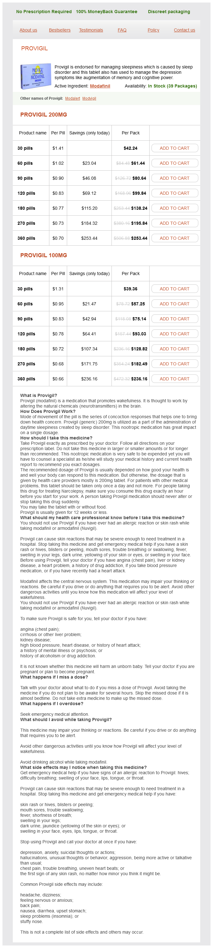 Provigil packs: 30 pills, 60 pills, 90 pills, 120 pills, 180 pills, 270 pills, 360 pills