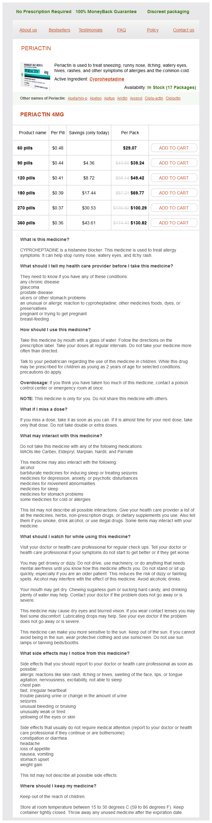 Periactin packs: 60 pills, 90 pills, 120 pills, 180 pills, 270 pills, 360 pills