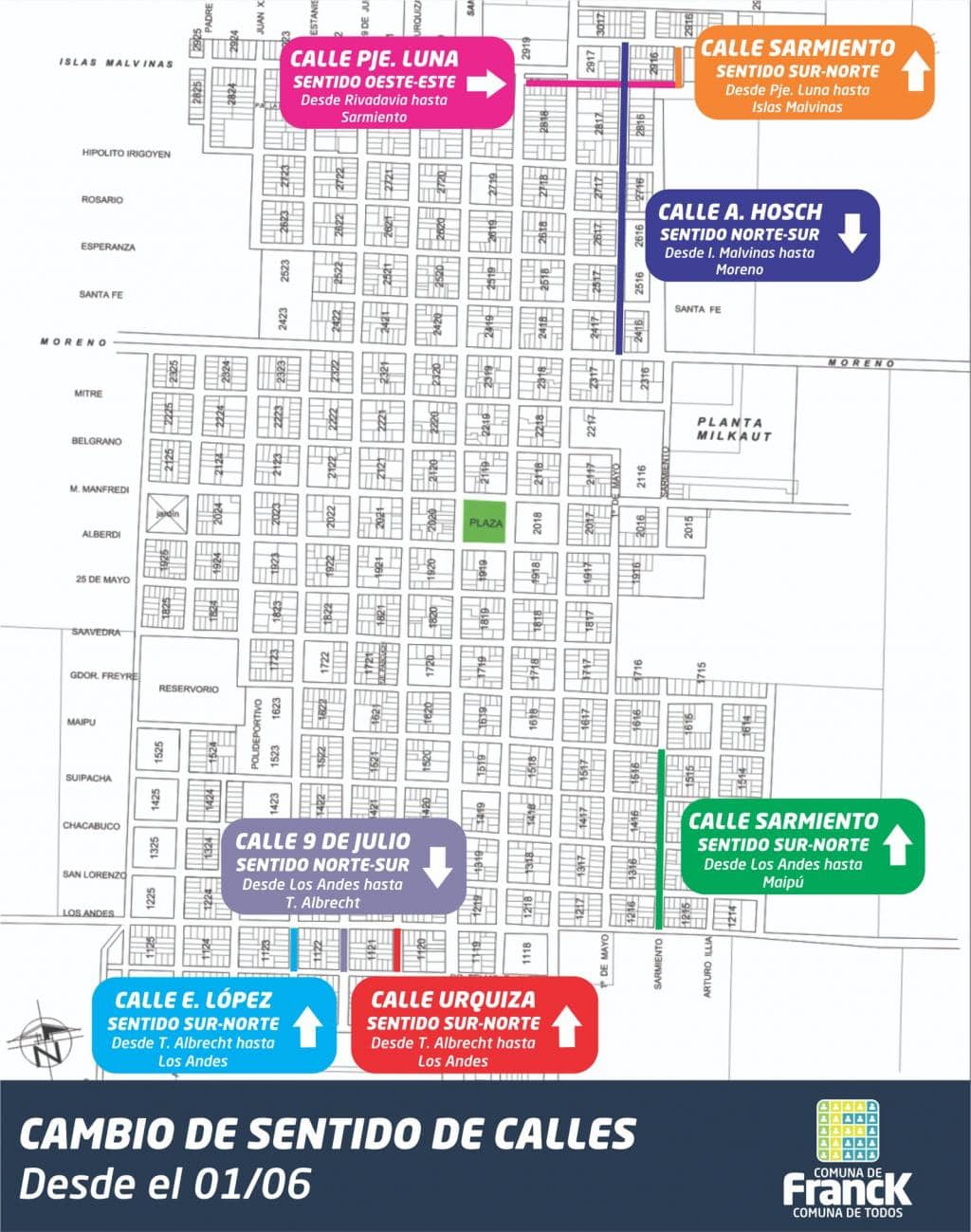 Los nuevos sentidos comenzarán a regir a partir del día 01/06. Personal comunal comenzará con el recambio de la cartelería correspondiente por lo cual solicitamos precaución sobre las arterias a modificar sus sentidos.