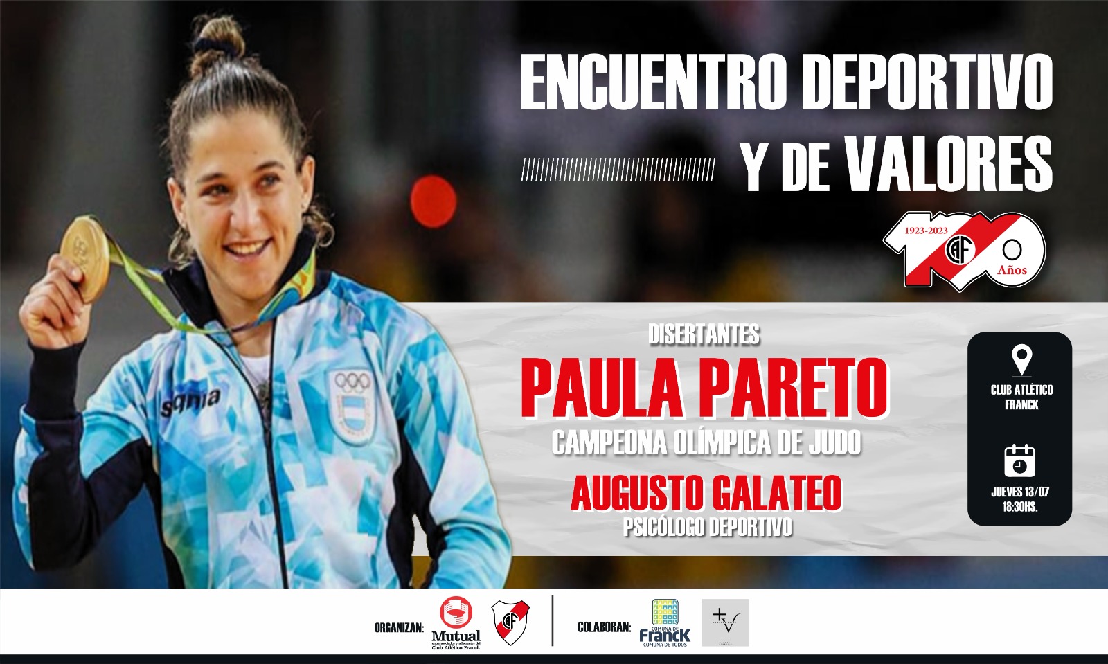 En el marco de los 100 años del Club Atlético Franck, la Mutual entre Asociados y Adherentes del C.A.F. con la colaboración de la Comuna de Franck, organizará un "Encuentro Deportivo y de Valores" el próximo jueves 13 de Julio en el cual disertará la campeona olímpica de judo Paula Pareto y el psicólogo deportivo Augusto Galateo.