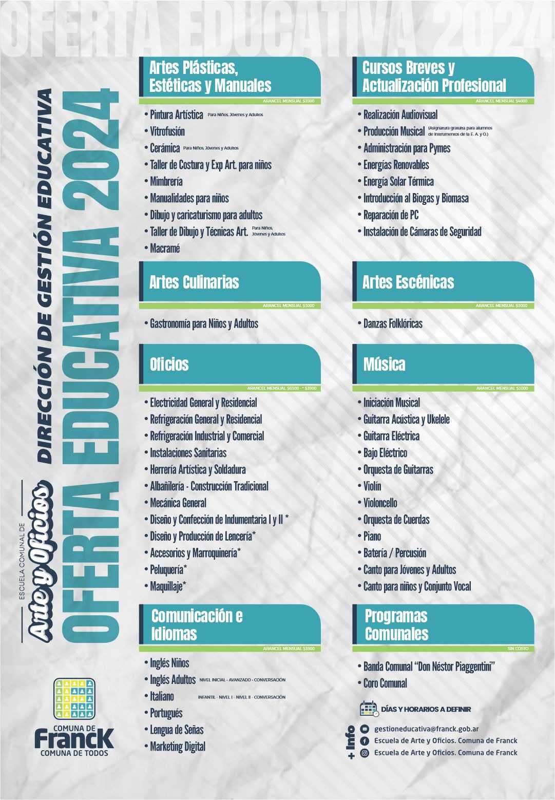 La Escuela de Arte y Oficios dependiente de la Dirección de Gestión Educativa de la Comuna de Franck, anunció su oferta educativa para el Ciclo Lectivo 2024. La misma cuenta con perfiles establecidos en materia educativa, recreativa, artística, y de capacitación laboral, con presencialidad de los cursos, talleres y programas.