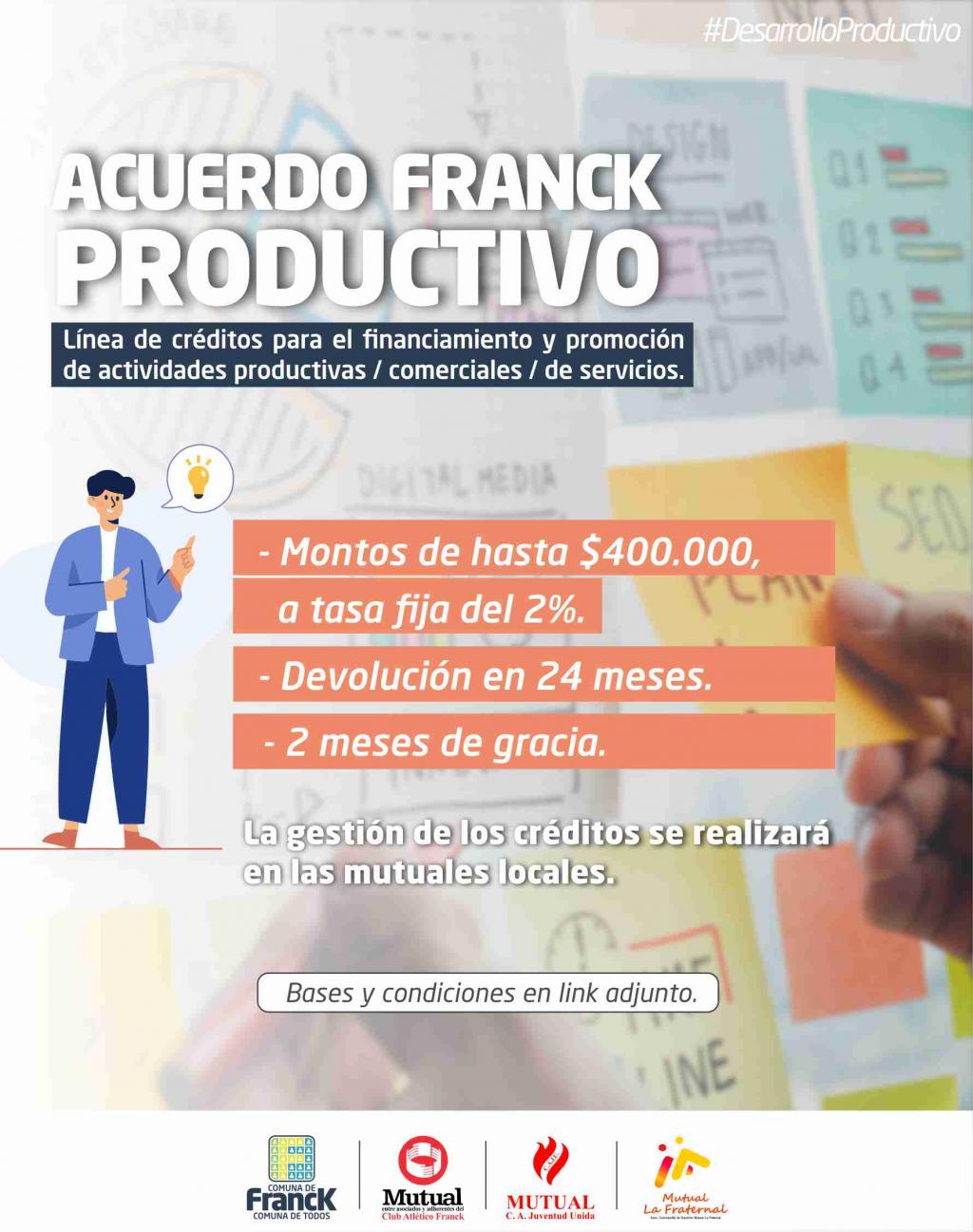 La línea de créditos “Acuerdo Franck Productivo”, está destinada a todas las personas de la localidad pertenecientes a actividades, industriales, comerciales y de servicios, que desean agregar valor a su negocio, principalmente a monotributistas, microemprendedores y empresas pymes.