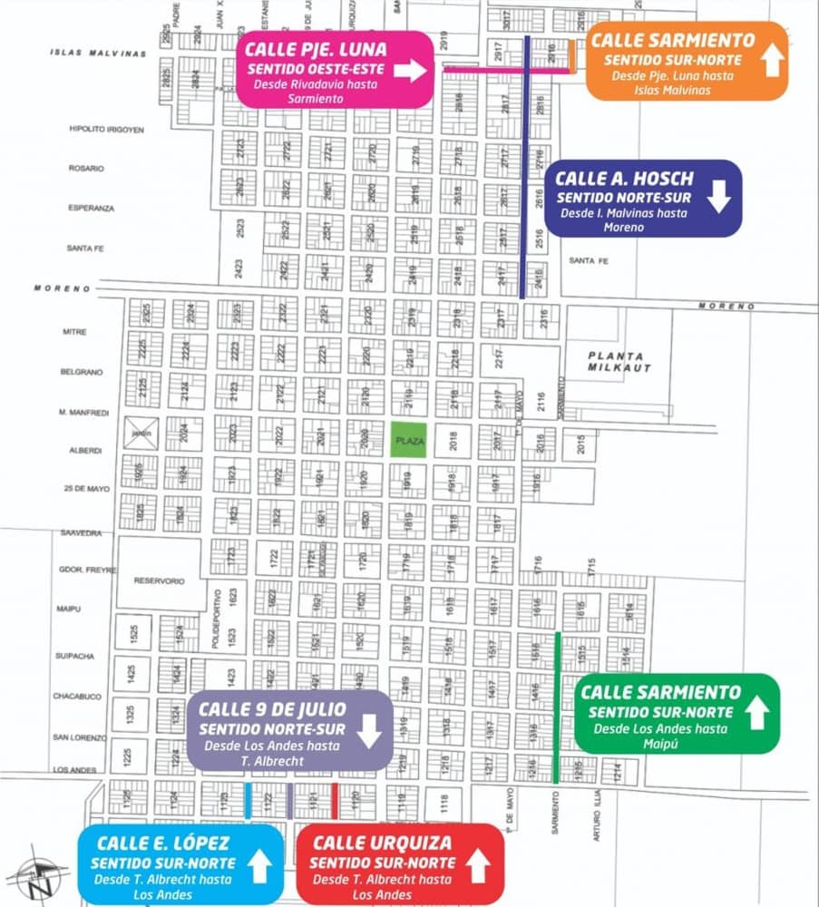 Teniendo en cuenta el avance en la obra de pavimento urbano y con el fin, además, de seguir adoptando medidas que aporten a un mejor ordenamiento vehicular y seguridad vial de los transeúntes, se modificarán los sentidos de diferentes tramos calles de la localidad de doble sentido a sentido único, según se detalla a continuación: